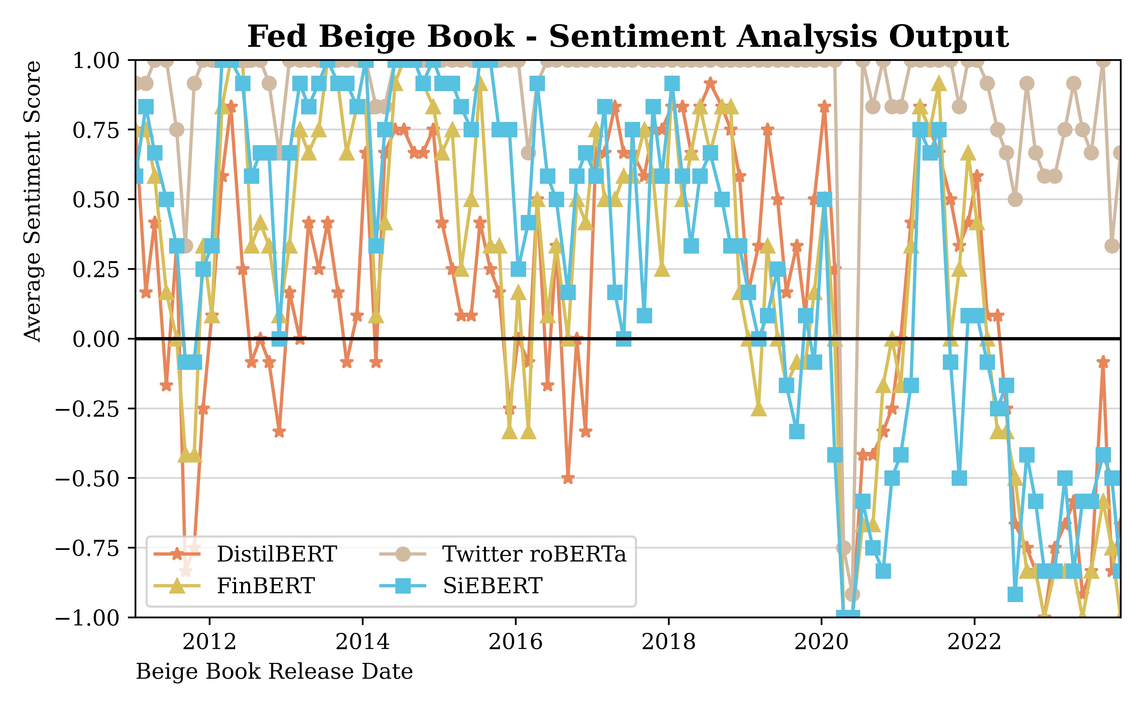 By construction, the Beige Book is a look-back measure and does not have very strong predictive power. The only interesting correlation was with interest rates, which is expected given that the Fed uses the Beige Book to inform its decisions. We note, however, that interest rates remained stable and very low for most of the sample, which suggests a high likelihood of overfitting in the data.